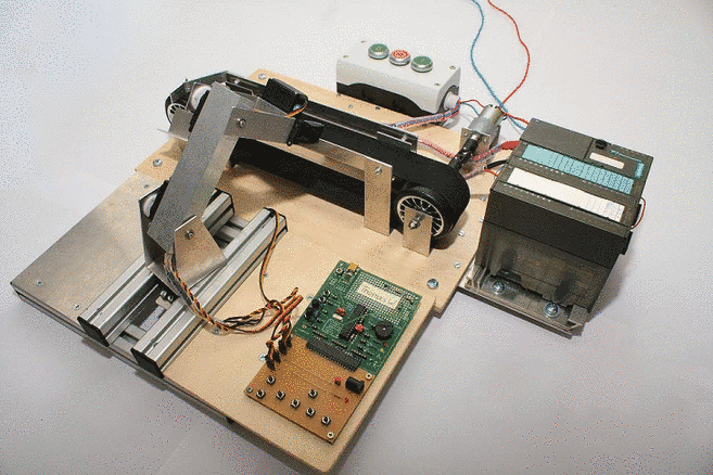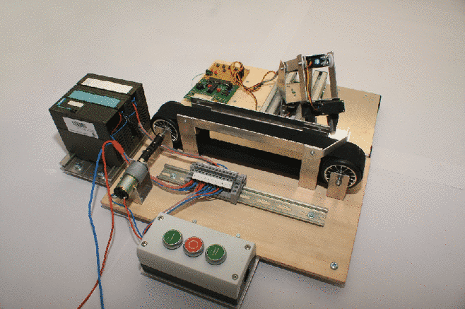 Die Beförderungsanlage besteht zum Einen aus einem Förderband und zum Anderen aus dem Förderband. Das Förderband transportiert Materialien zur Ablagefläche und der Roboter nimmt diese dann auf und legt sie wo anders hin. Das Förderband sowie der Roboter lassen sich jeweils einzeln steuern (Stufe I & Stufe II) und über den Stopptaster lässt sich die Anlage ausschalten.
