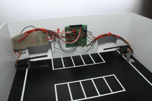 Zum Ein- und Ausfahren der Parkanlage, muss die Lichtschranke mit einer Karte durchzogen werden, die dann die Schranken öffnet. Eine 7-Segmentanzeige zeigt bis zu 20 freie Parkplätze im Parkhaus an. Mit jedem öffnen der Einfahrtsschranke zählt die Anzeige eins runter. Bei 0 kann die Schranke nicht mehr geöffnet werden. Dieser Vorgang funktioniert umgekehrt bei der Ausfahrt, also die Anzeige zählt wieder eins hoch.