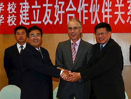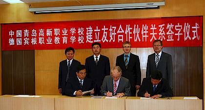 Am gestrigen Dienstag Nachmittag fand der Höhepunkt unseres Besuches der Qingdao High-New Vocational School statt: die Schulleiter der beiden Partnerschulen, Herr Duan Yongtian und Herr Johannes Olliges, haben in feierlichem Rahmen in Anwesenheit des lokalen Chefs der Kommunistischen Partei Chinas, Herrn Qu Xueshi , von Herrn Professor Xiang Guanqi und Vertretern beider Schulen die Partnerschaftsurkunde ratifiziert.