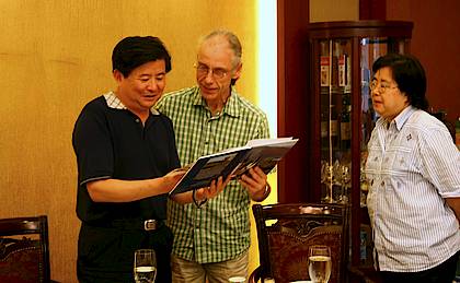 Entsprechend mit höheren Weihen ausgestattet, fuhren wir bei strömendem Regen mit dem Minibus zurück nach Jinan. Nach einem kurzen Abstecher zu den Baotu-Quellen in einem wunderschön gelegenen Park ging es zu einem (na einmal raten …) mächtig-gewaltigen Abendessen mit zwei Abteilungsleitern des Erziehungsministeriums der Provinz Shandong, Herrn Yu Bing Wen, zuständig für internationale Beziehungen und Herrn Sun Yonghai, zuständig für die berufsbildenden Schulen, und – man staune – Herrn Chen Guang Hua, dem Erziehungsminister der Provinz - mit immerhin 90 Millionen Einwohnern - persönlich. Ein netter Mensch! Ein Nachtzug brachte uns dann schlafend nach Shanghai; wo wir das Wochenende verbringen …