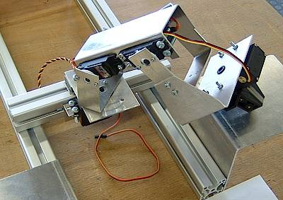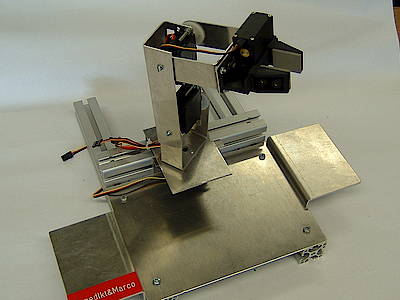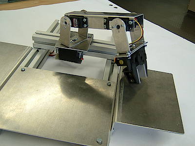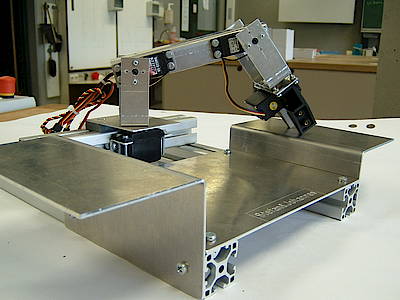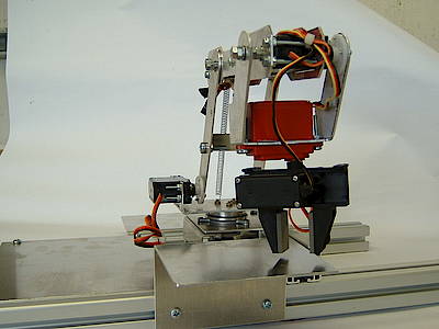 Der Roboterarm ist auf dem Grundgestell mit einem Motor um ca. 180° drehbar. Über zwei Gelenke (Achsen) wird der Greifarm mittels Servomotore in der Höhe verstellt und über den angebauten Greifer können kleine Lasten gegriffen werden.