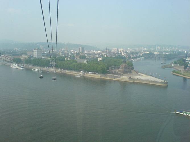Die BuGa-Seilbahn überspannt den Rhein. Rechts sind das deutsche Eck und die Mosel zu sehen.