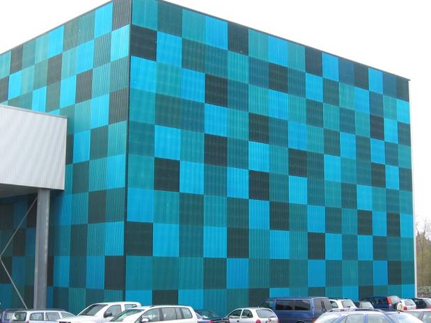 Das neue vollautomatische Hochregallager. Die Fassade hat der Bruder des Firmeninhabers gestaltet, der ein Künstler ist.