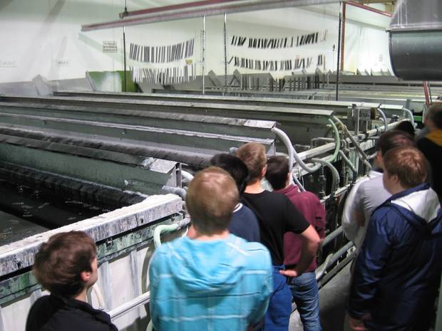 Anschliessend wurde die Klasse in zwei Gruppen geteilt und durch die Produktion geführt. Alutechta veredelt Aluminiumoberflächen für Kunden aus ganz Europa. Auch können Oberflächen mit Pulver farbig beschichtet werden. Ebenso gehört die spanende Bearbeitung von Aluminium nach Kundenauftrag zu den Bereichen, in denen alutechta tätig ist. Das Hochregallager von alutechta für die Rohmaterialien war ebenfalls sehenswert. Und zwar innen und aussen.