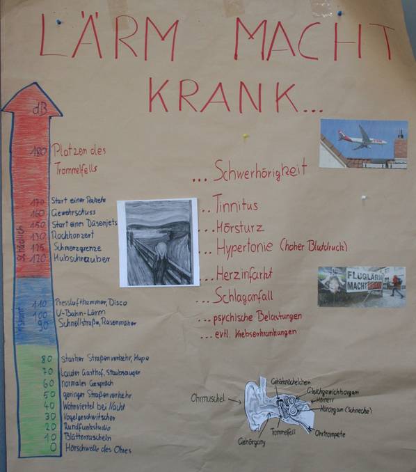In der Vorbereitungsphase erstellte die Klasse MfA (Arzthelferinnen) zusammen mit Frau Dr. Bartelke Plakate mit vielen Informationen zum Thema „Hören“. Hier wurde erklärt, wie das Ohr aufgebaut ist und das Hören funktioniert. Außerdem wurde gefragt: „Macht Lärm krank?“ und „Welche Krankheiten verursacht Lärm?“