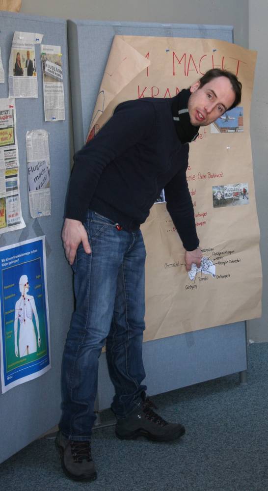 An der 2. Station im Aufenthaltsraum wurde vor der Plakatwand eine rege Diskussion über ein aktuelles Thema geführt. Herr Bara stellte die Frage: „Macht Fluglärm krank?“ Zahlreiche Zeitungsausschnitte der letzten Wochen dienten als Gesprächsgrundlage.