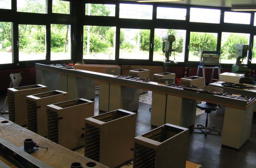 Da es in der Werkstatt vier Bankreihen zu je vier Arbeitsplätzen gibt, wurde pro Woche jeweils eine Bankreihe umgebaut. Zuerst musste der Kabelkanal für die Stromversorgung abgeklemmt und demontiert werden. Danach konnten die Schüler die alten Arbeitsplatten von den Werkzeugschränken abschrauben und herunternehmen.