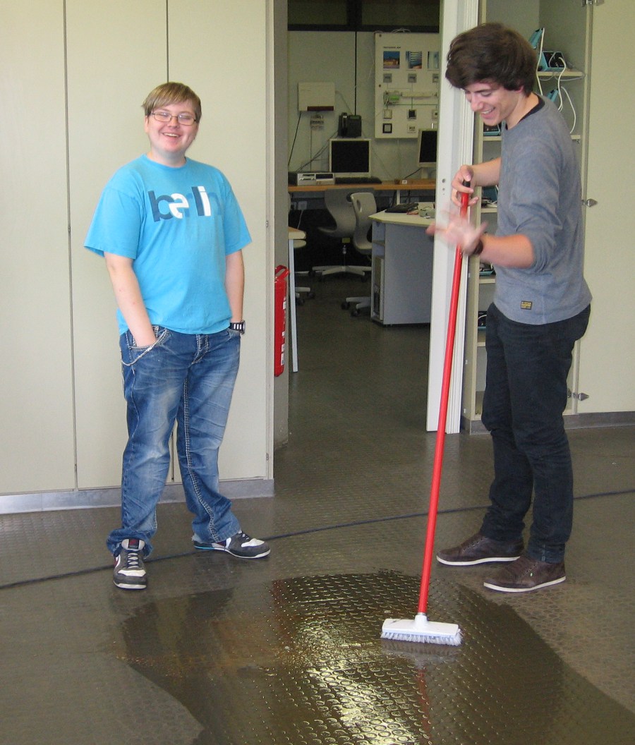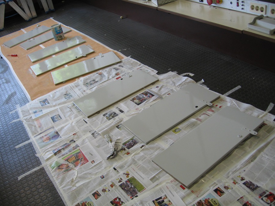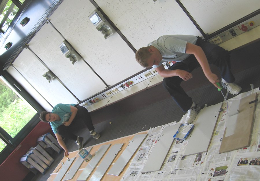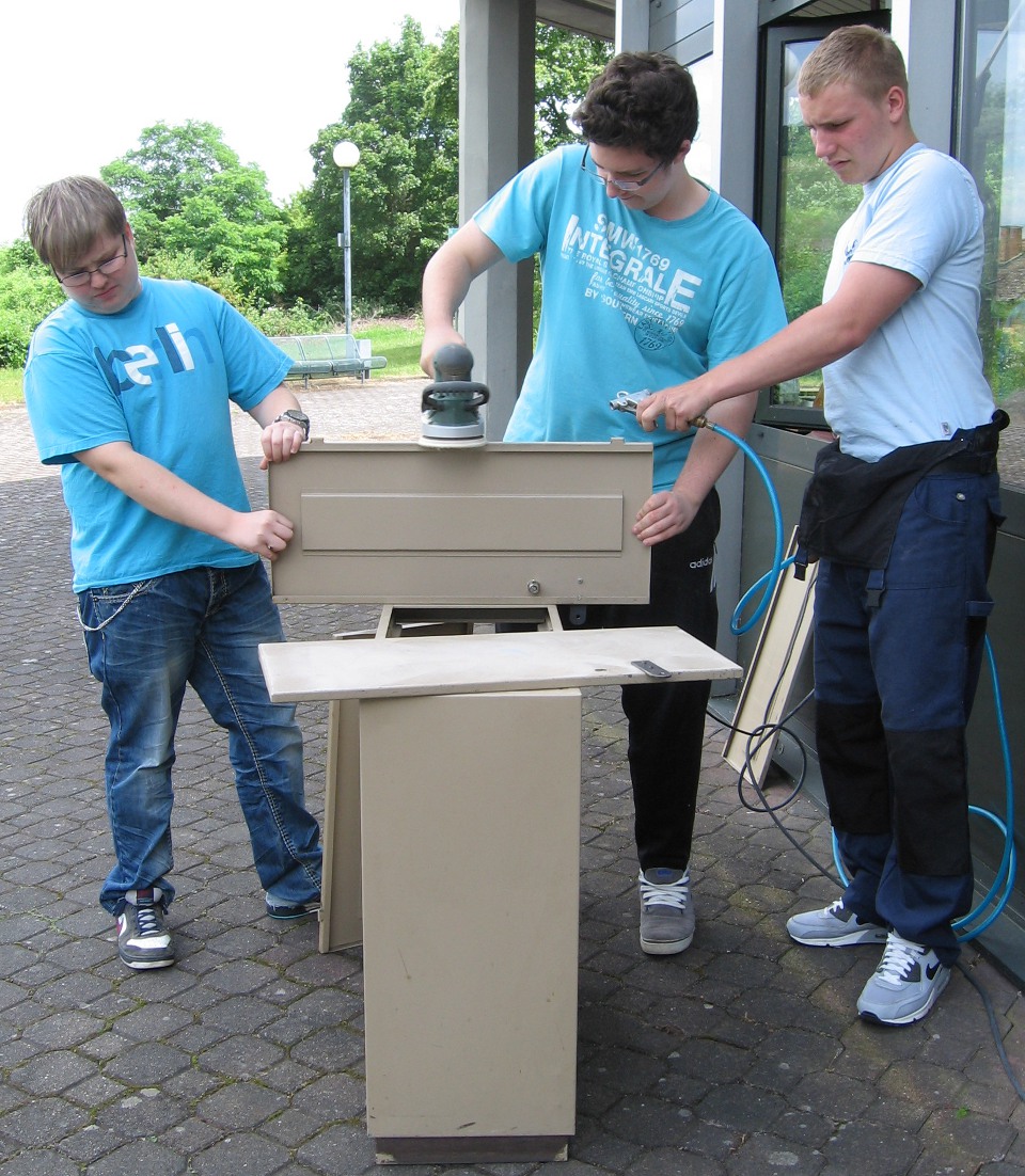 Im Anschluss daran konnten die Werkzeugschränke vom Boden losgeschraubt werden und im Schulhof abgeschliffen werden. Jetzt konnten sie in der Werkstatt frisch in hellgrau lackiert und wieder am Boden montiert werden, welcher natürlich zuvor gründlich gereinigt wurde.