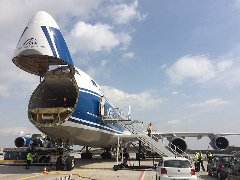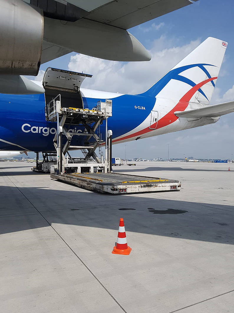 Nachdem der Rundgang beendet war, erwartete die Klasse noch ein besonderes Highlight. Die Schüler wurden eingeladen, bei der Beladung eines Frachtflugzeuges live dabei sein zu dürfen. Hierfür wurden wir wieder von einem Shuttle-Bus abgeholt und in Richtung Rollfeld gebracht. Um auf das Rollfeld zu gelangen, musste jede Person durch eine weitere Sicherheitskontrolle, welche der einer normalen Passagierkontrolle gleicht. Nachdem alle die Kontrolle passiert hatten, ging es auf direktem Weg zum Rollfeld, wo das Frachtflugzeug – eine Boeing 747-400 – bereits beladen wurde. In kleinen Gruppen konnten wir das Flugzeug von innen und außen anschauen. Besondere Höhepunkte waren hierbei die Beladung der Frachtmaschine über die Flugzeugnase, sowie der Blick in das Cockpit des Flugzeuges.