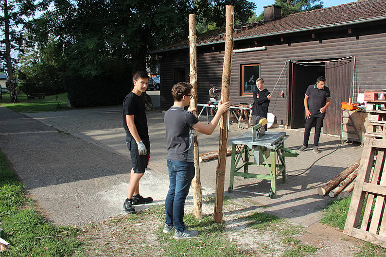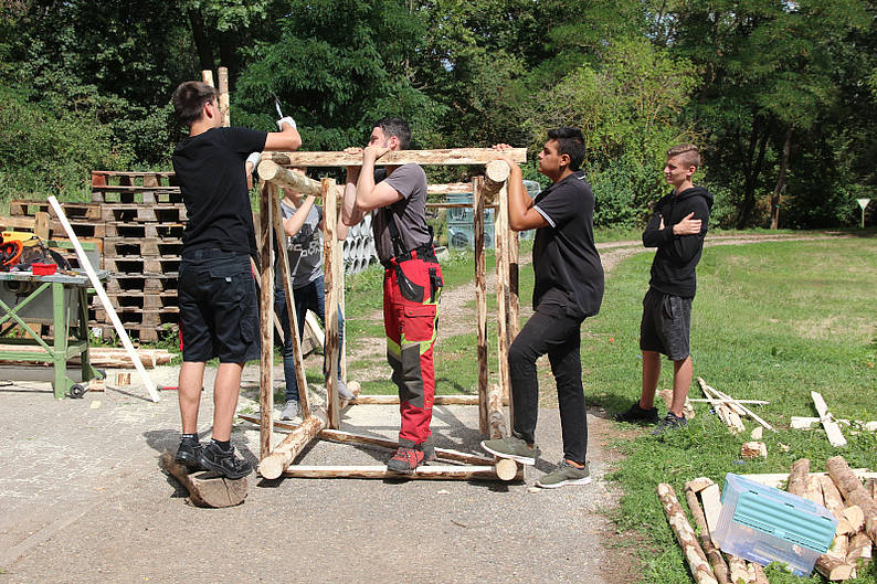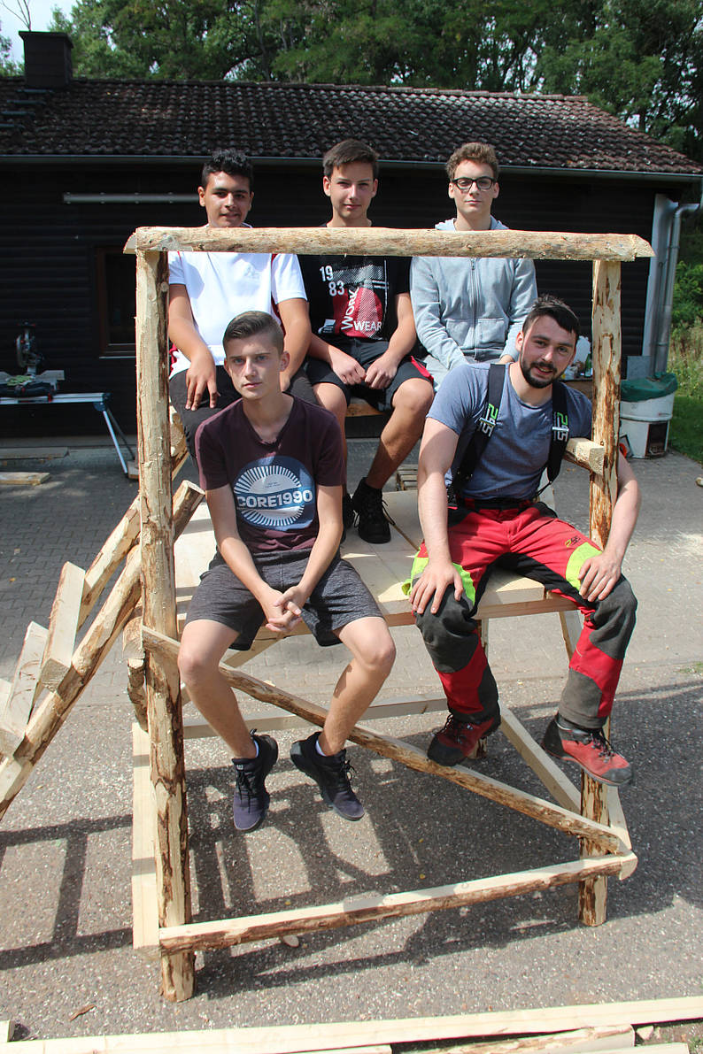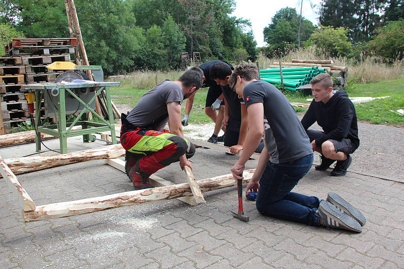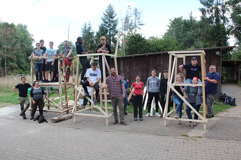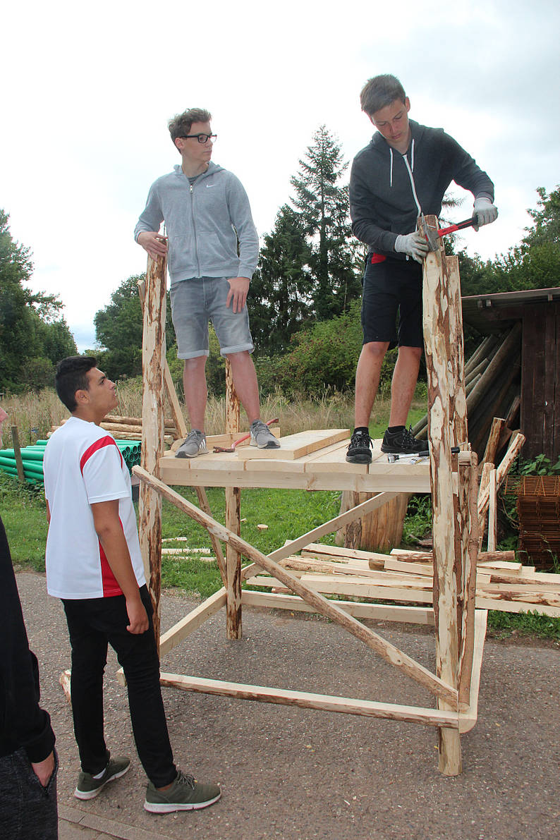 Am 2. und 3. Tag bauten drei Gruppen je einen Drückjagdbock. Einer aus den selbst-geschlagenen Stangen, 2 aus Konstruktionsholz. Tatkräftig unterstützt wurden sie dabei von Jäger-Azubi Christian Friedrich und der FÖJ-lerin Lena Rausch, unserer Sägemeisterin.