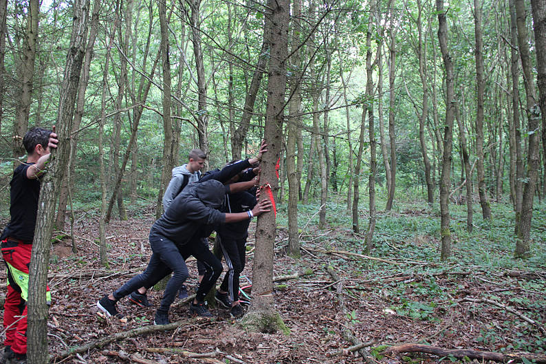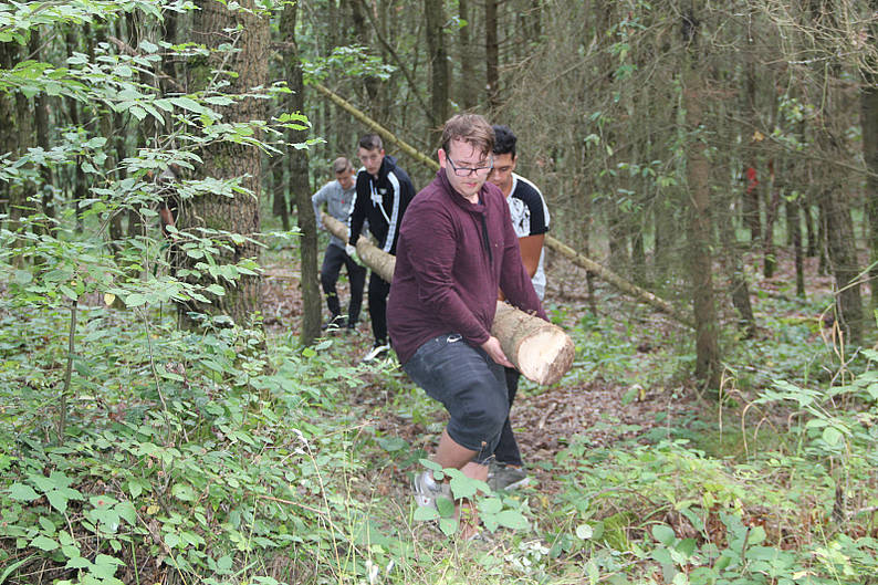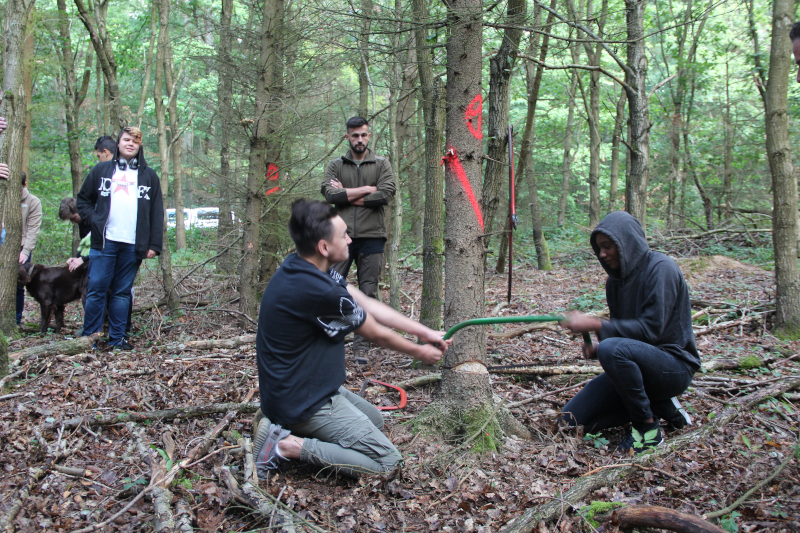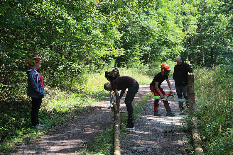 Am ersten Tag ging es in den Wald bei Waldböckelheim, wo die Schüler*innen unter Anleitung von Revierjäger Mathias Klisa und Revierjagdmeister Robert Ackermann lernten, ausgesuchte Bäume mit der Bügelsäge zu „fällen“. Anschließend ging es ans Entasten und Schälen der Stämme. Eine schweißtreibende Angelegenheit, die sich im Team am besten bewältigen ließ. Für viele Schüler*innen war das Arbeiten im Wald die erste Begegnung mit der „Wildnis“.