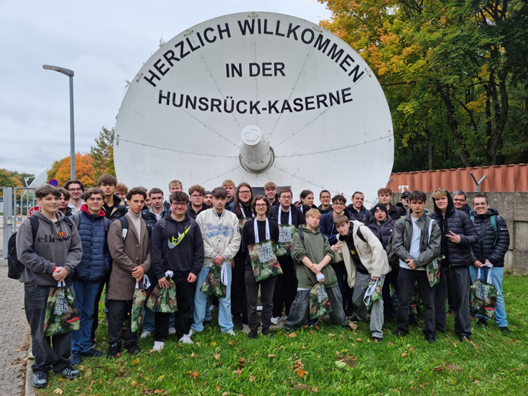 Das Karrierezentrum der Bundeswehr hatte uns zu einem Berufsinformationstag eingeladen. In diesem Rahmen fuhren die beiden Jahrgangsstufen der Höheren Berufsfachschule für Informationstechnik (HBFIT) am 06. Okt. zum IT-Bataillon der Bundeswehr nach Kastellaun. Nach dem Transfer durch die Bundeswehr wurden am Kasernentor erst einmal gründlich die Personalien geprüft, bevor wir von Soldaten des Bataillons begrüßt wurden. Anschließend stellte man uns die Fahrzeuge des Verbandes vor. Es gab Gelegenheit diese näher anzuschauen und sich reinzusetzten. Die Bewaffnung demonstrierte ein Soldat. Dabei gab es reichlich Zeit und Gelegenheit, sich mit den anwesenden Soldaten über deren Ausbildung, Tätigkeiten in der Einheit und Karrierewege zu unterhalten. Wieder zurück im Lehrsaal wurde die beeindruckende persönliche Ausrüstung eines Soldaten präsentiert. Es war schon interessant einmal am eigenen Leib zu spüren, wie es sich anfühlt, ausgestattet mit Schutzweste, Helm, Magazintaschen und weiteren Ausrüstungselementen zu laufen oder Liegestützen zu machen. Im Keller des Gebäudes konnten dann alle einmal ein Nachtsichtgerät testen. Nach einem - übrigens guten Essen - in der Bundeswehrkantine erhielten wir einen Einblick in die IT-Technik und damit die Kernaufgabe des Bataillons. Dazu gehören Satelitenkommunikation und Netzwerktechnik wie Router, Switches und Server. Wir standen also jeweils vor der Bundeswehrvariante der Technik, die wir schon im Unterricht behandelt hatten. Dabei betonten die Soldaten die immensen Bedeutung der elektronischen Kommunikation bei militärischen Einsätzen. Eine zweite Station befasste sich mit dem Leben im Felde. Es gab die Aufgabe ein Feuer zu entfachen und ein Zweimannzelt, die berühmte "Dackelgarage" aufzubauen. Unterm Strich konnten an diesem Tag alle einen Eindruck vom Arbeitsplatz "Informationstechniker" bei der Bundeswehr erhalten. Naturgemäß hatte der Militäraspekt einen großen Anteil, dabei wurde aber immer deutlich hervorgehoben, dass in der IT Techniker im Einsatz sind und keine Abenteurer oder Rambos. Im Übrigen legen alle Soldaten eine zivile IHK-Prüfung ab und es gibt viele Möglichkeiten sich fortzubilden und weitere Abschlüsse zu erlangen.