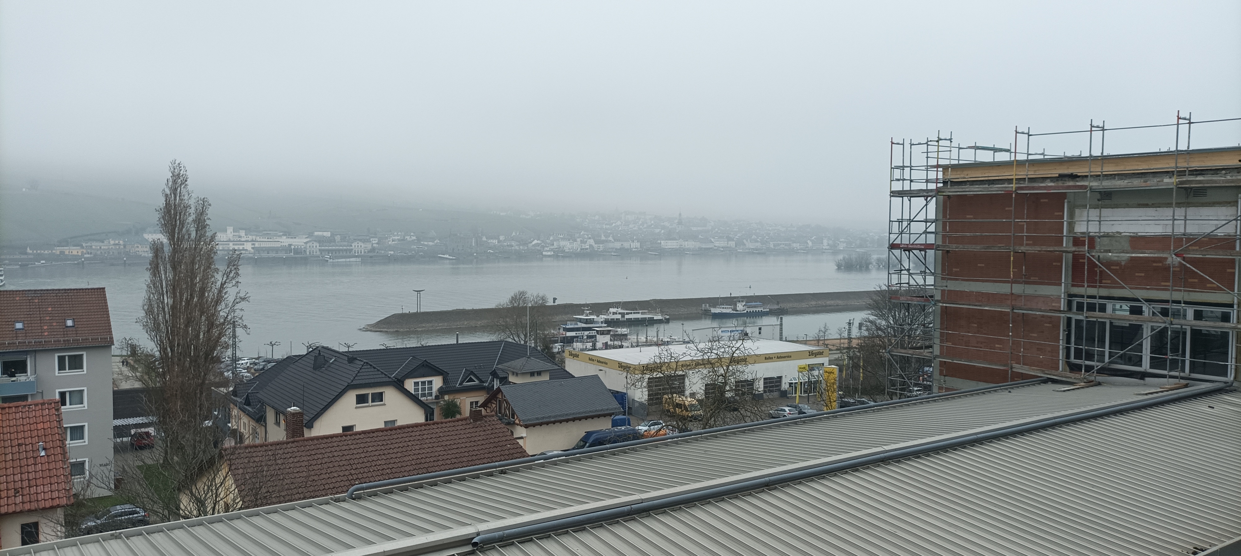 Blick vom Neubau auf den Rhein. Im Vordergrund das Dach des A-Trakts, welcher zum Ende der Baumaßnahme abgerissen wird.