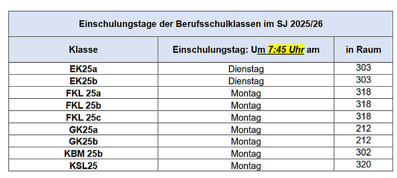 Die Einschulung der verschiedenen Klassen, sowie die Uhrzeit für Ihren Bildungsgang